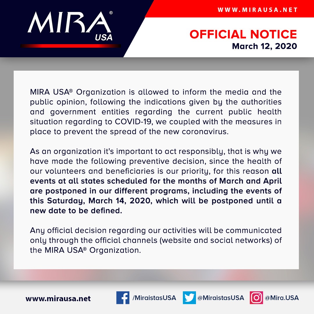 March 12, 2020 – Our organization, MIRA USA, has decided to postpone all of the national events scheduled for the months of March and April starting today.